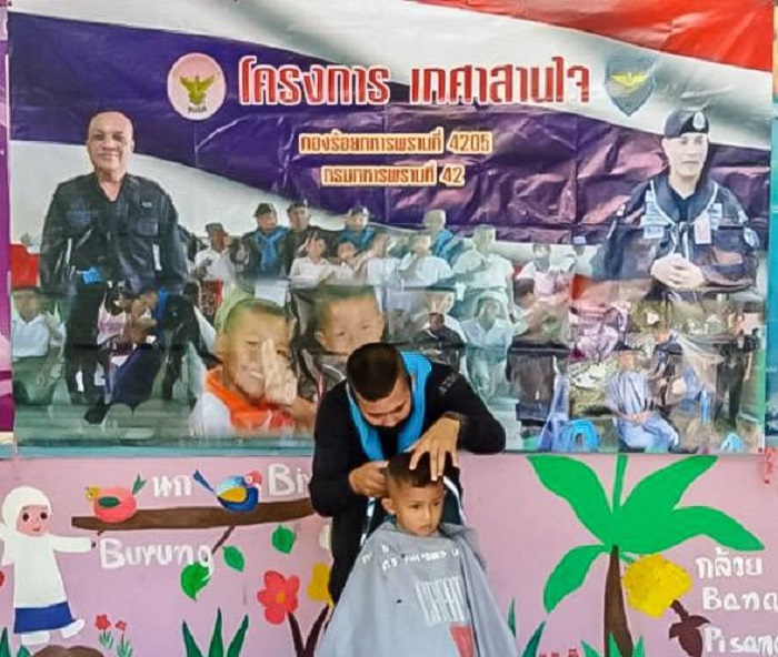 วันนี้ ( 25 ส.ค.63 เวลา 10.00 น. ) ที่ โรงเรียนบ้านควนหยี หมู่ที่ 3 ตำบลปะโด อำเภอมายอ จังหวัดปัตตานี หน่วยเฉพาะกิจกรมทหารพรานที่ 42 โดย กองร้อยทหารพรานที่ 4205 จัดกำลังพล ชุดปฏิบัติการกิจการพลเรือนของหน่วย เข้าพบปะพัฒนาสัมพันธ์กับครู และนักเรียน โรงเรียนบ้านควนหยี พร้อมให้บริการตัดผมเคลื่อนที่ให้กับเด็กนักเรียน “ตามโครงการเกศาสานใจ” เพื่อเป็นการช่วยลดค่าใช้จ่ายให้กับผู้ปกครอง และสร้างสัมพันธ์อันดีระหว่างเจ้าหน้าที่กับคณะครู และนักเรียนในโรงเรียน ทั้งนี้เป็นนโยบายของกองทัพบกที่ให้หน่วยทหารทุกหน่วยของกองทัพบก เข้าไปช่วยเหลือประชาชนที่เดือดร้อนในทุกโอกาสตามศักยภาพของหน่วยที่สามารถปฏิบัติได้