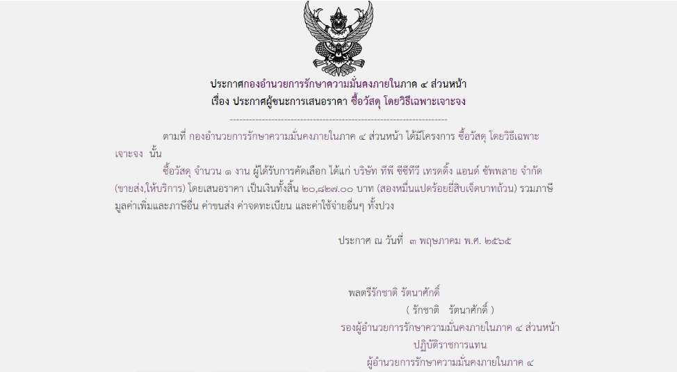 ประกาศผู้ชนะการเสนอราคา ซื้อวัสดุ โดยวิธีเฉพาะเจาะจง