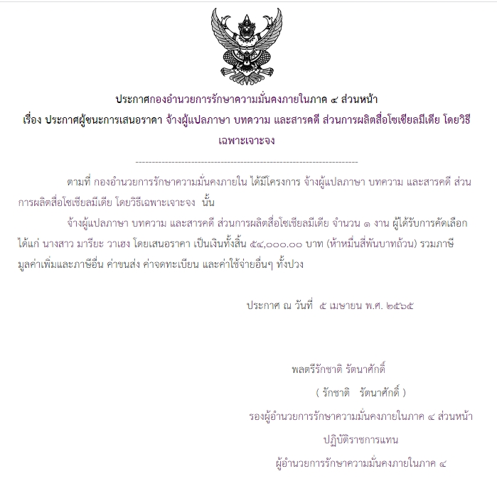 จัดซื้อ จัดจ้างประกาศผู้ชนะการเสนอราคา ประกาศผู้ชนะการเสนอราคา จ้างผู้แปลภาษา บทความ และสารคดี ส่วนการผลิตสื่อโซเชียลมีเดีย โดยวิธีเฉพาะเจาะจง May 5, 2022 503 Share Facebook Twitter Google+ Telegram LINE