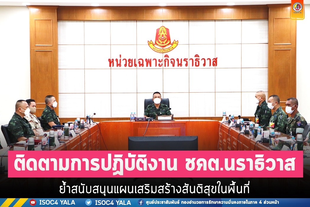 ทั้งนี้ รองผู้อำนวยการรักษาความมั่นคงภายในภาค 4 ส่วนหน้า และคณะได้รับฟังการบรรยายการปฏิบัติงานของหน่วยด้านการสร้างความตระหนักรู้ การประชาสัมพันธ์และการขับเคลื่อน ชคต.ที่ผ่านมา ด้านงานประชาสัมพันธ์ผ่านช่องทางสื่อต่างๆ ด้านภารกิจตามสั่งการของอำนวยการรักษาความมั่นคงภายในภาค 4 การปฏิบัติงานของ ชคต. การสร้างความเข้มแข็งมาตรฐานชุดคุ้มครองตำบลในพื้นที่จังหวัดนราธิวาส และส่วนสำคัญคือสร้างความตระหนักรู้ที่หน่วยได้ขับเคลื่อนอย่างต่อเนื่องเป็นการสร้างความเข้าใจแก่ประชาชน,หน่วยงานภาครัฐ ,และกำลังพล เพื่อสร้างการรับรู้ถึงการขับเคลื่อนภารกิจงานและกิจกรรมโครงการต่างๆ ในการช่วยกันคิด ช่วยกันทำ รวมถึงการขับเคลื่อน ชคต. ในปีนี้เน้นย้ำให้เป็นปีแห่งการเสริมสร้างความเข้มแข็งของ ชคต.ในพื้นที่