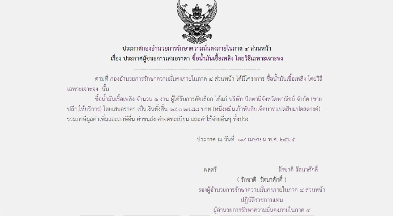 ประกาศผู้ชนะการเสนอราคา ซื้อน้ำมันเชื้อเพลิง โดยวิธีเฉพาะเจาะจง (19,017.88 บาท)