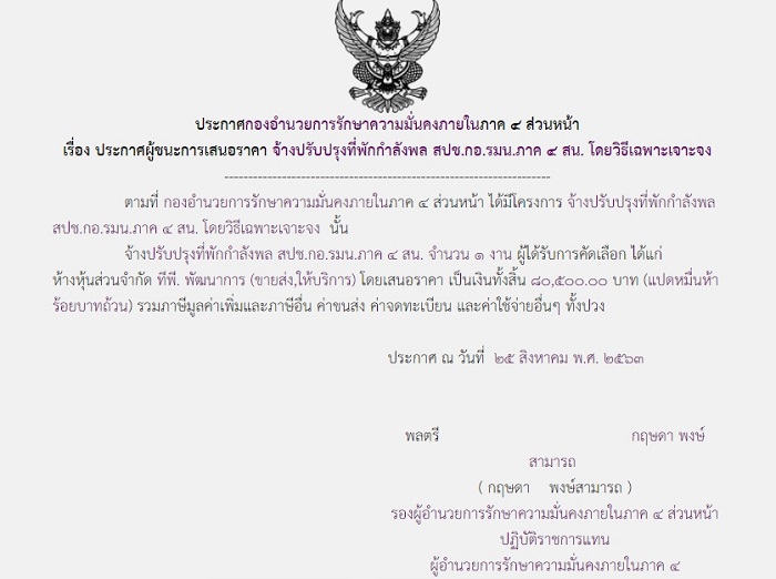 ประกาศผู้ชนะการเสนอราคา จ้างปรับปรุงที่พักกำลังพล สปช.กอ.รมน.ภาค 4 สน.โดยวิธีเฉพาะเจาะจง (80,500.00)