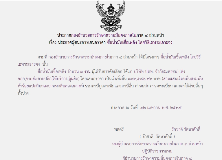 ประกาศผู้ชนะการเสนอราคา ซื้อน้ำมันเชื้อเพลิง โดยวิธีเฉพาะเจาะจง (๓๗๓,๕๘๒.๖๒บาท)