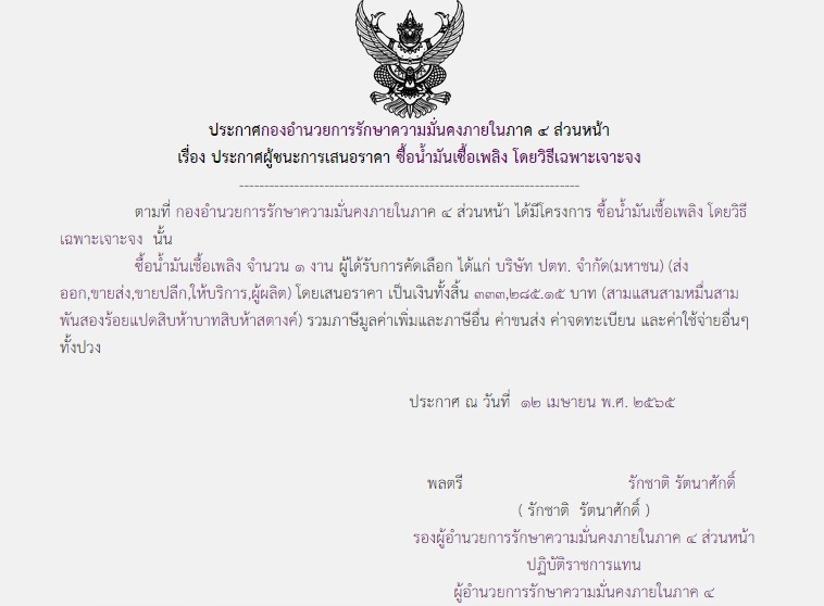 ประกาศผู้ชนะการเสนอราคา ซื้อน้ำมันเชื้อเพลิง โดยวิธีเฉพาะเจาะจง (๓๓๓,๒๘๕.๑๕บาท)