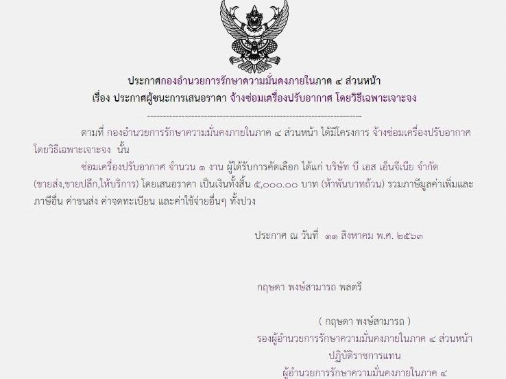 ประกาศผู้ชนะการเสนอราคา จ้างซ่อมเครื่องปรับอากาศ โดยวิธีเฉพาะเจาะจง (5,000.00)