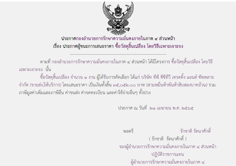 ประกาศผู้ชนะการเสนอราคา ซื้อวัสดุสิ้นเปลือง โดยวิธีเฉพาะเจาะจง (35,052 บาท)