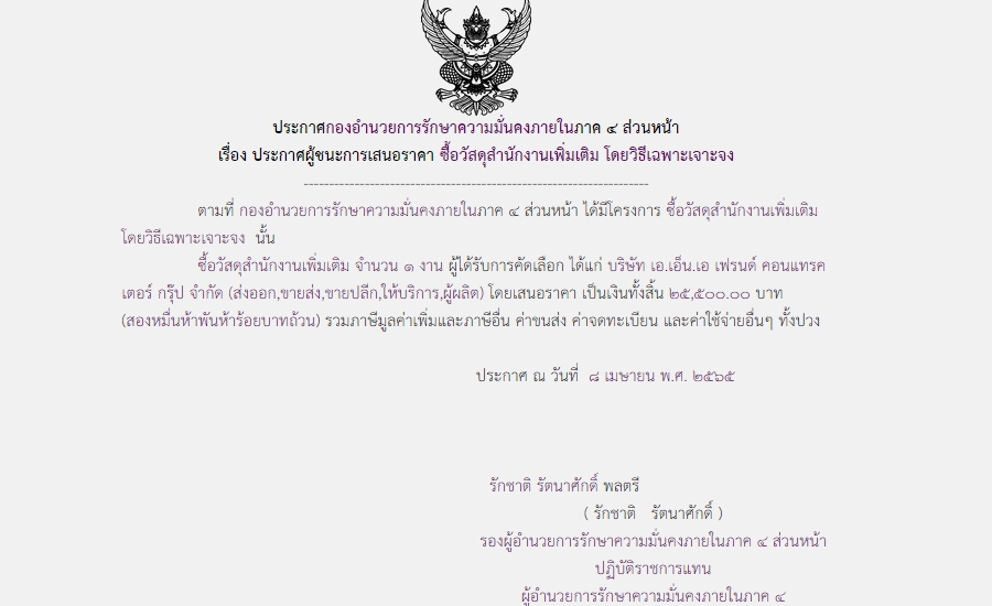 ประกาศผู้ชนะการเสนอราคา ซื้อวัสดุสำนักงานเพิ่มเติม โดยวิธีเฉพาะเจาะจง