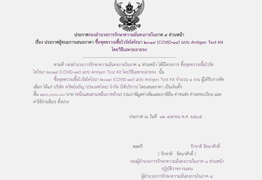 จัดซื้อ จัดจ้างประกาศผู้ชนะการเสนอราคา ประกาศผู้ชนะการเสนอราคา ซื้อชุดตรวจเชื้อไวรัสโคโรนา 2019 (COVID-19) แบบ Antigen Test Kit โดยวิธีเฉพาะเจาะจง May 12, 2022 510 Share Facebook Twitter Google+ Telegram LINE