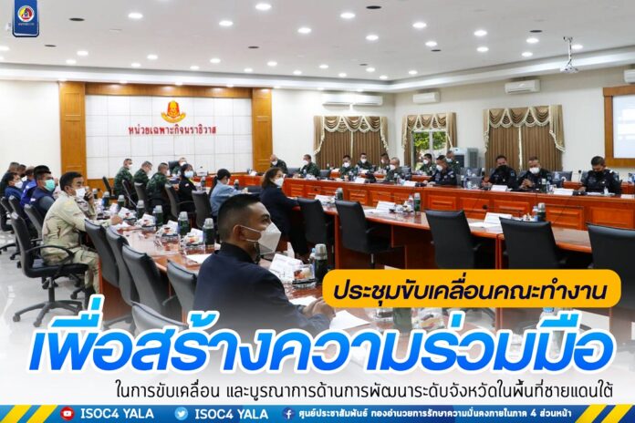 จากนั้นเวลา 13.30 น. พลตรีเฉลิมพล จินารัตน์ ผู้อำนวยการส่วนพัฒนายุทธศาสตร์ กองอำนวยการรักษาความมั่นคงภายในภาค 4 ส่วนหน้า และคณะ เดินทางต่อไปยังหน่วยเฉพาะกิจยะลา เพื่อติดตามการประชุมการขับเคลื่อนคณะทำงานประสานงานเพื่อสร้างความร่วมมือในการขับเคลื่อนและบูรณาการด้านการพัฒนาในระดับจังหวัดของกองอำนวยการรักษาความมั่นคงภายในภาค 4 ส่วนหน้า ประจำปี 2565 ผ่านกลไกสภาสันติสุขตำบล (สภาประชาธิปไตยตำบล) ตามแบบฟอร์มติดตามให้คำแนะนำในการขับเคลื่อนงานด้านการพัฒนา ไตรมาส 2 โดยมีคณะทำงาน จากส่วนราชการระดับจังหวัด, ผู้แทนจาก ศูนย์อำนวยการบริหารจังหวัดชายแดนภาคใต้ ทหาร, ตำรวจ และฝ่ายปกครอง เข้าร่วมประชุมในครั้งนี้
