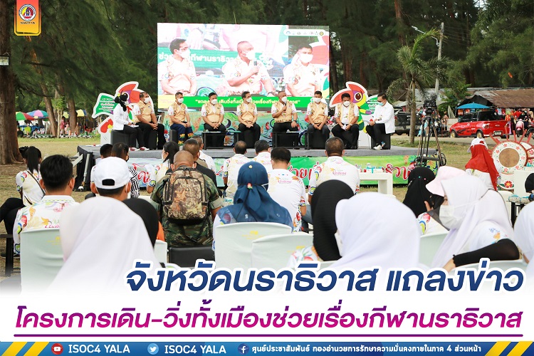 วันที่ 15 พฤษภาคม 2565 ณ ชายหาดนราทัศน์ อำเภอเมือง จังหวัดนราธิวาส พลโท เกรียงไกร ศรีรักษ์ แม่ทัพภาคที่ 4/ผู้อำนวยการรักษาความมั่นคงภายในภาค 4 นายสนั่น พงษ์อักษร ผู้ว่าราชการจังหวัดนราธิวาส นายชนาสิน สิมะดำรงค์ รองผู้จัดการกองทุนพัฒนาการกีฬาแห่งชาติ พลโท ธิรา แดหวา แม่ทัพน้อยที่ 4 นายบุญพาส รักนุ้ย รองเลขาธิการศูนย์อำนวยการบริหารจังหวัดชายแดนภาคใต้ นายพรรณภพ อุ่นเสียม ผู้อำนวยการสำนักงานการกีฬาแห่งประเทศไทยภาค 4 นายวิเชษฐ์ ไทยทองนุ่ม นายกสมาคมกีฬาแห่งจังหวัดนราธิวาส ร่วมกับส่วนราชการ หน่วยงานที่เกี่ยวข้องร่วม แถลงข่าวจัดโครงการรณรงค์สร้างกระแสการออกกำลังกายแบะเล่นกีฬา “เดิน-วิ่ง ทั้งเมืองช่วยเรื่องกีฬานราธิวาส” ประจำปี 2565 กำหนดพิธีเปิดโครงการฯ เดิน-วิ่งพร้อมกัน ทั้ง 13 อำเภอ ของจังหวัดนราธิวาส ในวันที่ 22 พฤษภาคม 2565 ณ สนามกีฬาจังหวัดนราธิวาส ใช้นกเงือกเป็นสัญญาลักษณ์ในการวิ่ง โดยกองทุนพัฒนาการกีฬาแห่งชาติสนับสนุนงบประมาณในการจัดโครงการฯ เพื่อรณรงค์สร้างกระแสการออกกำลังกายกับประชาชนให้ครอบคลุมทั้งจังหวัดนราธิวาส รวมถึงส่งเสริมการท่องเที่ยว เศรษฐกิจและสร้างภาพลักษณ์ที่ดีแกจังหวัดนราธิวาส