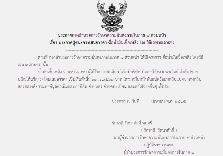 ประกาศผู้ชนะการเสนอราคา ซื้อน้ำมันเชื้อเพลิง โดยวิธีเฉพาะเจาะจง