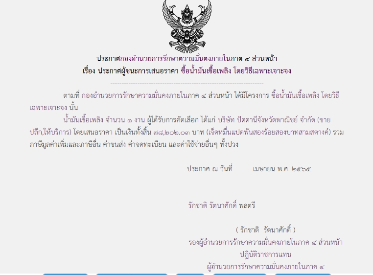 ประกาศผู้ชนะการเสนอราคา ซื้อน้ำมันเชื้อเพลิง โดยวิธีเฉพาะเจาะจง