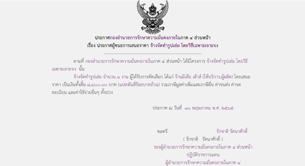 ประกาศผู้ชนะการเสนอราคา จ้างจัดทำรูปเล่ม โดยวิธีเฉพาะเจาะจง
