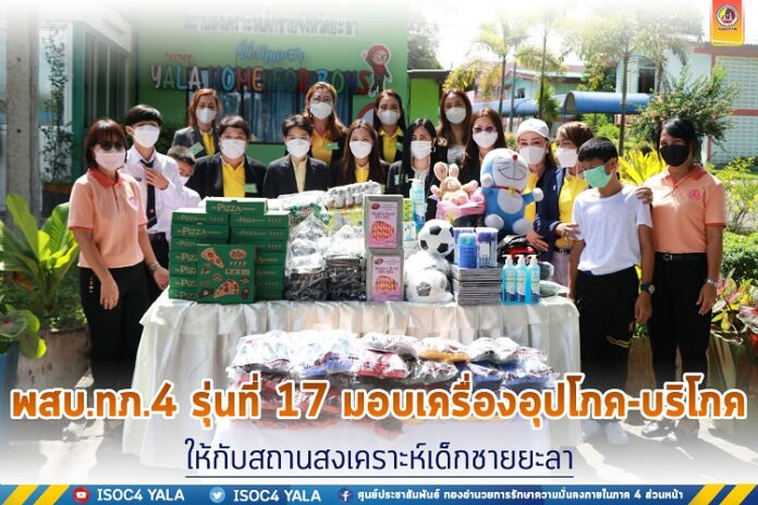วันนี้ (20 พฤษภาคม 2565 ) เวลา 13.50 น. ณ สถานสงเคราะห์เด็กชายยะลา จังหวัดยะลา พันเอก อุทัย รุ่งสงข์ ผู้อำนวยการหลักสูตรพัฒนาสัมพันธ์ระดับผู้บริหาร กองทัพภาคที่ 4 พร้อมด้วย คณะนักศึกษาหลักสูตรพัฒนาสัมพันธ์ระดับผู้บริหาร กองทัพภาคที่ 4 รุ่นที่ 17 (พสบ.ทภ.4 รุ่น 17) ลงพื้นที่มอบเครื่องอุปโภค – บริโภค ให้แก่ สถานสงเคราะห์เด็กชายยะลา โดยมี นางสาวชมฤดี นาทะศิริ ผู้ปกครองสถานสงเคราะห์เด็กชายยะลา จังหวัดยะลา บุคลากรครู เจ้าหน้าที่ และเด็ก ๆ สถานสงเคราะห์เด็กชายจังหวัดยะลา ร่วมให้การต้อนรับ ภายใต้มาตรการป้องกันการแพร่ระบาดของเชื้อไวรัส covid-19 อย่างเคร่งครัด