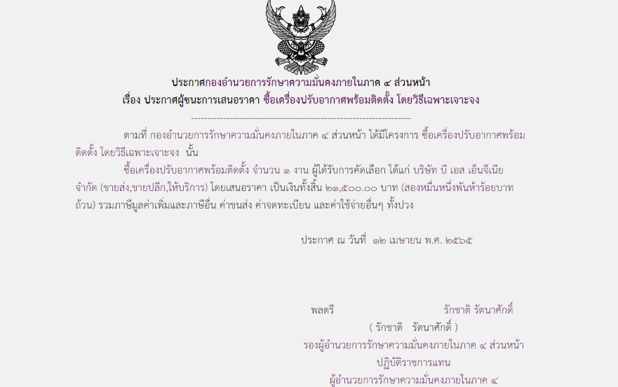 ประกาศผู้ชนะการเสนอราคา ซื้อเครื่องปรับอากาศพร้อมติดตั้ง โดยวิธีเฉพาะเจาะจง