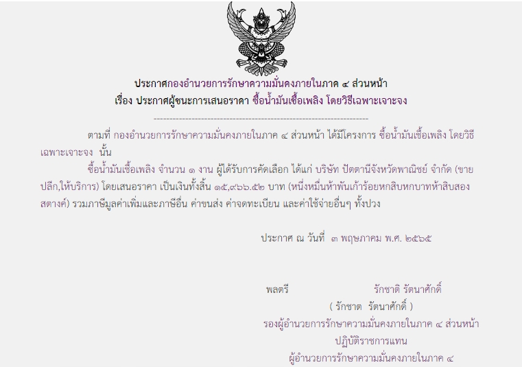ประกาศผู้ชนะการเสนอราคา ซื้อน้ำมันเชื้อเพลิง โดยวิธีเฉพาะเจาะจง (15,966.52 บาท)