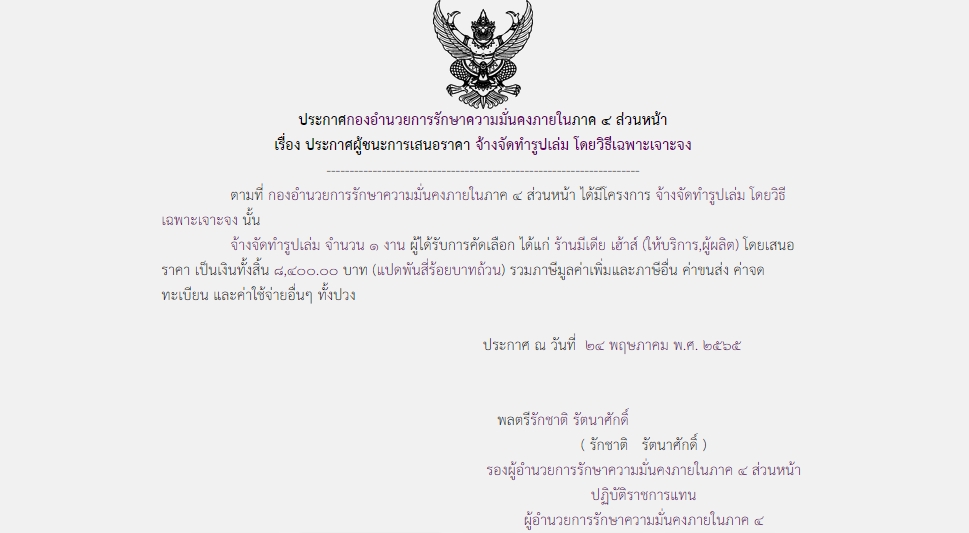ประกาศผู้ชนะการเสนอราคา จ้างจัดทำรูปเล่ม โดยวิธีเฉพาะเจาะจง (8,400.00 บาท)