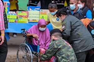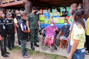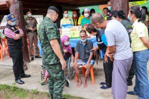 เวลา 13.30 น. จากนั้นผู้บังคับหน่วยเฉพาะกิจสงขลา เดินทางต่อไปยังบ้านเลขที่ 48 หมู่ 3 บ้านพลีใต้ ตำบลนาทวี อำเภอนาทวี จังหวัดสงขลา มอบรถเข็นผู้ป่วย (วิลแชร์) พร้อมมอบสิ่งของอุปโภค – บริโภค ให้กับนายฮาหมาด อิหมำหมาด ป่วยอัลไซเมอร์ และนางไมเน๊าะ อิหมำหมาดเนาะ ป่วยเป็นโรคหัวใจ เบาหวานความดัน ดวงตาพร่ามัว ซึ่งทั้งสองเป็นสามีภรรยา มีลูกด้วยกัน 3 คน ปัจจุบันอาศัยอยู่กับลูกคนสุดท้องเป็นผู้ดูแล มีรายได้จากการทำสวนยางพาราและเบี้ยเลี้ยงผู้สูงอายุ พร้อมกันนี้ผู้บังคับหน่วยเฉพาะกิจสงขลาได้พบปะพูดคุยให้กำลังใจกับครอบครัวของผู้ป่วยอย่างเป็นกันเอง สร้างรอยยิ้มและความสุขให้กับทุกคน โดยมีหัวหน้าส่วนราชการ, ผู้นำท้องที่, ผู้นำท้องถิ่น ตลอดจนประชาชนในพื้นที่ใกล้เคียงร่วมให้การต้อนรับ