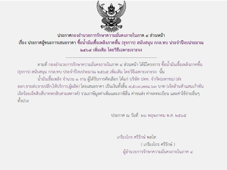 จัดซื้อ จัดจ้างประกาศผู้ชนะการเสนอราคา ประกาศผู้ชนะการเสนอราคา ซื้อน้ำมันเชื้อเพลิงภาคพื้น (ธุรการ) สนับสนุน กกล.ทบ. ประจำปีงบประมาณ 2565 เพิ่มเติม โดยวิธีเฉพาะเจาะจง ( 7,509,774.63 บาท )(2) May 26, 2022 570 Share Facebook Twitter Google+ Telegram LINE