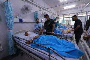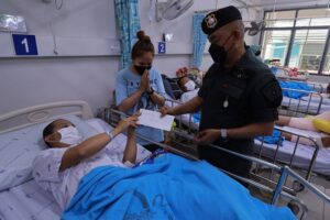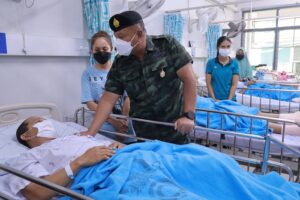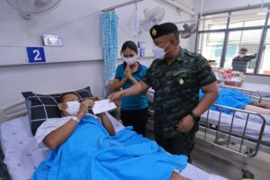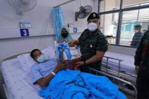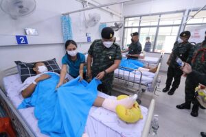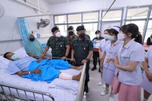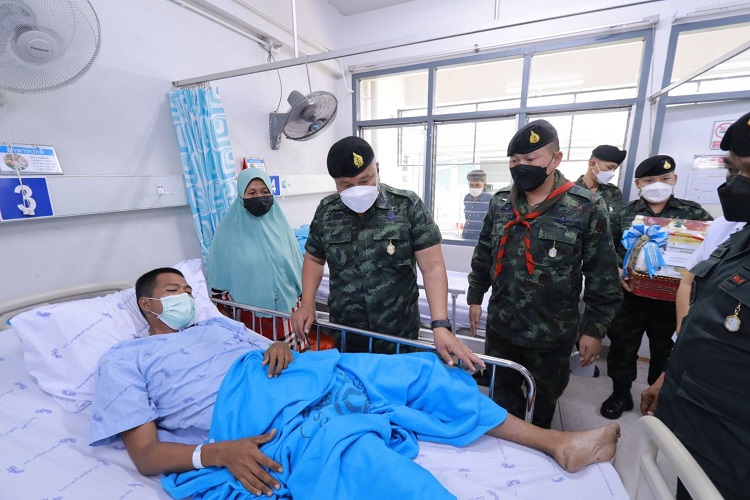 วันนี้ 27 พฤษภาคม 2565 เวลา 13.00 น. ที่ โรงพยาบาลนราธิวาสราชนครินทร์ อำเภอเมือง จังหวัดนราธิวาส พลโท เกรียงไกร ศรีรักษ์ แม่ทัพภาคที่ 4 /ผู้อำนวยการรักษาความมั่นคงภายในภาค 4 เดินทางพร้อมด้วย พลตำรวจโท นันทเดช ย้อยนวล ผู้บัญชาการตำรวจภูธรภาค 9 และพลตรี เฉลิมพร ขำเขียว ผู้บัญชาการกองพลทหารราบที่ 15/ผู้บังคับหน่วยเฉพาะกิจนราธิวาส เยี่ยมให้กำลังใจ พลทหาร สุไลมาน ยูโซ๊ะ กำลังพลสังกัดกองร้อยควบคุมป้องกันชายแดนที่ 4, สมาชิกเอก โอภาส แสนซม และสมาชิกเอก เอกวัฒน์ เกตุด้วง 2 เจ้าหน้าที่กองอาสารักษาดินแดน อำเภอตากใบ ซึ่งได้รับบาดเจ็บจากเหตุคนร้ายไม่ทราบจำนวนขว้างระเบิดไปร์บอม และโจมตีฐานปฏิบัติการตำรวจน้ำตากใบ บริเวณท่าเทียบเรือรัชดา หมู่ที่ 1 ตำบลจ๊ะเห อำเภอตากใบ จังหวัดนราธิวาส เมื่อวันที่ 25 พฤษภาคม 2565 ที่ผ่านมา เหตุการณ์ดังกล่าวทำให้มีเจ้าหน้าที่ได้รับบาดเจ็บจำนวน 3 ราย ขณะนี้กำลังเข้ารักษาตัวที่โรงพยาบาลนราธิวาสราชนครินทร์ อาการเบื้องต้นปลอดภัยดี