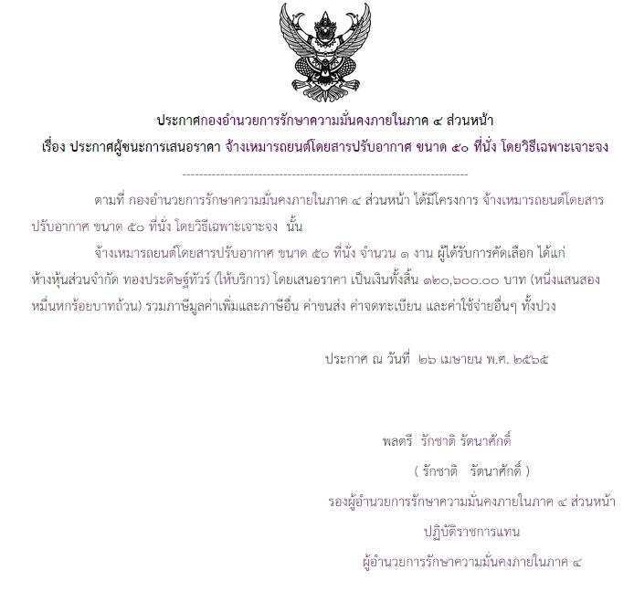 ประกาศผู้ชนะการเสนอราคา จ้างเหมารถยนต์โดยสารปรับอากาศ ขนาด 50 ที่นั่ง โดยวิธีเฉพาะเจาะจง ( 120,600.00 บาท )