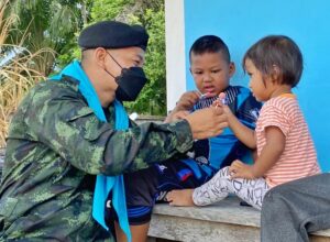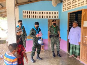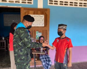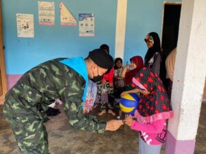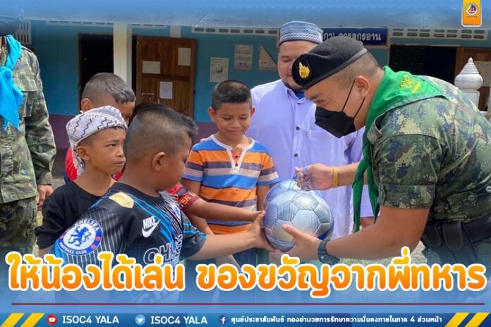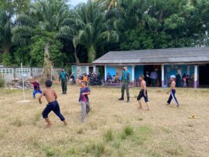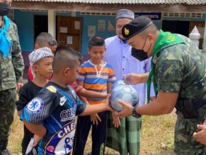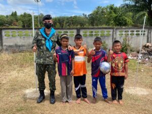 นอกจากนี้ เจ้าหน้าที่ทหารยังได้มอบลูกฟุตบอลให้กับน้องๆ เยาวชนไว้เล่นกีฬาใช้เวลาว่างให้เกิดประโยชน์ สุขภาพร่างกายแข็งแรง โดยเจ้าหน้าที่ทหารได้ร่วมเล่นฟุตบอลกับน้องๆ เยาวชน บรรยากาศเป็นไปด้วยความอบอุ่น น้องๆ เยาวชนมีรอยยิ้ม และดีใจที่มีพี่ๆ ทหารได้เข้ามาพบปะสานสัมพันธ์กันในวันนี้