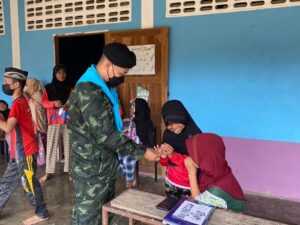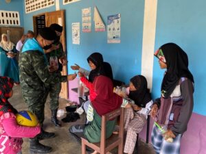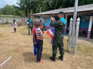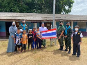 หน่วยเฉพาะกิจสงขลาที่ 40 จัดกำลังพลชุดเสริมสร้างความเข้าใจ ลงพื้นที่พบปะพัฒนาสานสัมพันธ์กับคณะครู เยาวชนโรงเรียนตาดีกากอเราะห์อัน หมู่ที่ 4 บ้านกระอาน ตำบลท่าม่วง อำเภอเทพา จังหวัดสงขลา พร้อมมอบธงชาติไทยผืนใหม่ โดยเปลี่ยนธงชาติผืนเก่าที่มีสีซีด ให้เป็นธงชาติผืนใหม่ที่มีสีสดใส