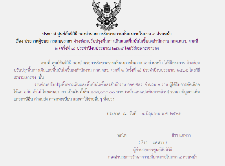 จัดซื้อ จัดจ้างประกาศผู้ชนะการเสนอราคา ประกาศผู้ชนะการเสนอราคา จ้างซ่อมปรับปรุงพื้นทางเดินและพื้นบันไดขึ้นลงสำนักงาน กกศ.ศสว. งวดที่ 2 (ครั้งที่ 1) ประจำปีงบประมาณ 2565 โดยวิธีเฉพาะเจาะจง ( 108,000.00 บาท ) June 3, 2022 498 Share Facebook Twitter Google+ Telegram LINE