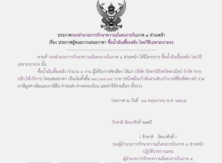 ประกาศผู้ชนะการเสนอราคา ซื้อน้ำมันเชื้อเพลิง โดยวิธีเฉพาะเจาะจง ( 19,039.44 บาท )