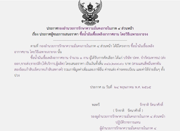 ประกาศผู้ชนะการเสนอราคา ซื้อน้ำมันเชื้อเพลิงอากาศยาน โดยวิธีเฉพาะเจาะจง