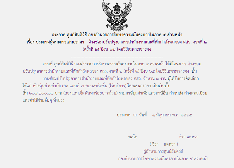 จัดซื้อ จัดจ้างประกาศผู้ชนะการเสนอราคา ประกาศผู้ชนะการเสนอราคา จ้างซ่อมปรับปรุงอาคารสำนักงานและที่พักกำลังพล ศสว. งวดที่ ๒ (ครั้งที่ ๒) ปีงบ ๖๕ โดยวิธีเฉพาะเจาะจง June 6, 2022 484 Share Facebook Twitter Google+ Telegram LINE