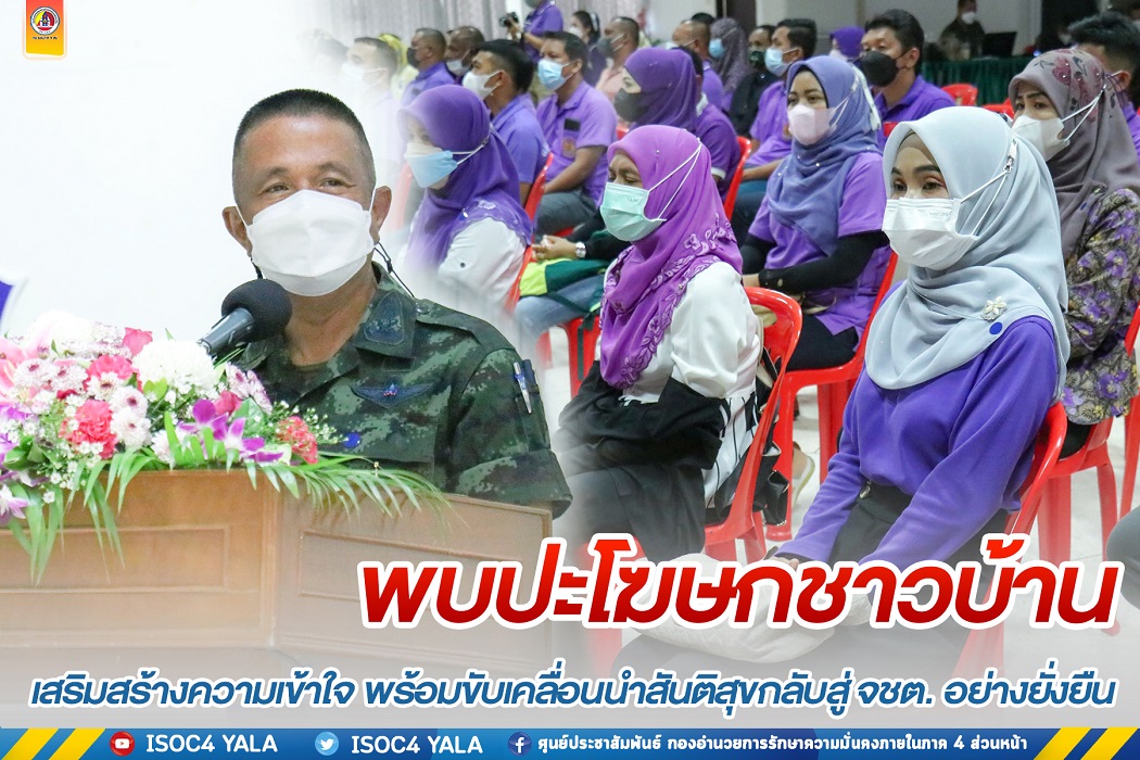 เมื่อ (7 มิถุนายน 2565) เวลา 11.00 น. ที่ สโมสรนายทหารสัญญาบัตร กองพลทหารราบที่ 15 ค่ายสมเด็จพระสุริโยทัย ตำบลบ่อทอง อำเภอหนองจิก จังหวัดปัตตานี พลตรี ปราโมทย์ พรหมอินทร์ รองผู้อำนวยการรักษาความมั่นคงภายในภาค 4 ส่วนหน้า เป็นประธานพบปะโฆษกชาวบ้านในพื้นที่ 3 จังหวัดชายแดนภาคใต้ และ 4 อำเภอของจังหวัดสงขลา เพื่อมอบนโยบายและให้แนวทางการขับเคลื่อนงานโฆษกชาวบ้านในพื้นที่ ก่อนรับฟังข้อซักถาม ปัญหาขัดข้องในห้วงที่ผ่านมา พร้อมข้อเสนอแนะจากโฆษกชาวบ้านในพื้นที่ โดยมี ผู้แทนหน่วยเฉพาะกิจยะลา , ผู้แทนหน่วยเฉพาะกิจปัตตานี , ผู้แทนหน่วยเฉพาะกิจนราธิวาส , ผู้แทนหน่วยเฉพาะกิจสงขลา , กำลังพลจากสำนักสารสนเทศ กองอำนวยการรักษาความมั่นคงภายในภาค 4 ส่วนหน้า ตลอดจนโฆษกชาวบ้านในพื้นที่ 3 จังหวัดชายแดนภาคใต้ และ 4 อำเภอของจังหวัดสงขลา กว่า 500 คน ร่วมในกิจกรรม
