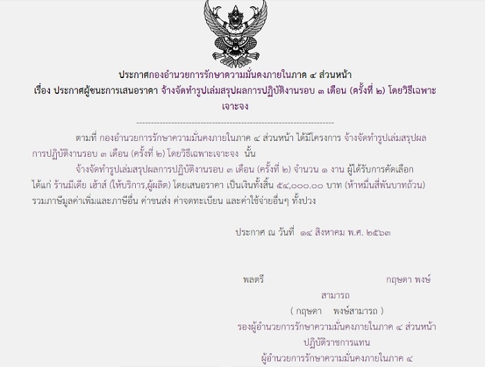 จัดซื้อ จัดจ้างประกาศผู้ชนะการเสนอราคา ประกาศผู้ชนะการเสนอราคา จ้างจัดทำรูปเล่มสรุปผลการปฏิบัติงานรอบ 3 เดือน (ครั้งที่ 2 ) โดยวิธีเฉพาะเจาะจง (54,000.00) August 28, 2020 1118 Share Facebook Twitter Google+ Telegram LINE สบป.กอ.รมน.ภาค 4 สน.