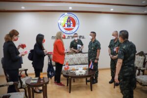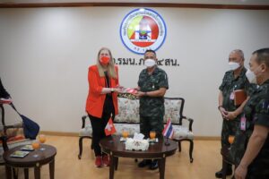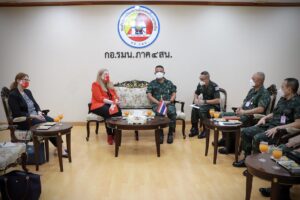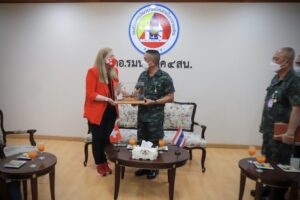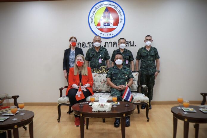 วันนี้ 8 มิถุนายน 2565 เวลา 14.00 น. ณ ห้องรับรอง กองอำนวยการรักษาความมั่นคงภายในภาค 4 ส่วนหน้า ตำบลเขาตูม อำเภอยะรัง จังหวัดปัตตานี พลตรี ปราโมทย์ พรหมอินทร์ รองผู้อำนวยการรักษาความมั่นคงภายในภาค 4 ส่วนหน้า พร้อมด้วย เลขาธิการกองอำนวยการรักษาความมั่นคงภายในภาค 4 ส่วนหน้า ให้การต้อนรับ นางเฮเลเนอ บุดลีเกอร์ อาร์ทิเอดา เอกอัครราชทูตสมาพันธรัฐสวิส ประจำประเทศไทย และคณะ ในโอกาสเดินทางเยือนพื้นที่จังหวัดชายแดนภาคใต้ ในระหว่างวันที่ 8 – 9 มิถุนายน 2565 โดยได้เข้าเยี่ยมคารวะเพื่อกล่าวอำลาในโอกาสครบวาระดำรงตำแหน่งเอกอัคราชฑูตสมาพันธรัฐสวิสประจำประเทศไทย โดย รองผู้อำนวยการรักษาความมั่นคงภายในภาค 4 ส่วนหน้า ได้มอบของที่ระลึกพร้อมกล่าวแสดงความขอบคุณนางเฮเลเนอฯ ที่ได้ปฏิบัติหน้าที่เพื่อส่งเสริมความสัมพันธ์ระหว่างไทยและ สวิสเซอร์แลนด์