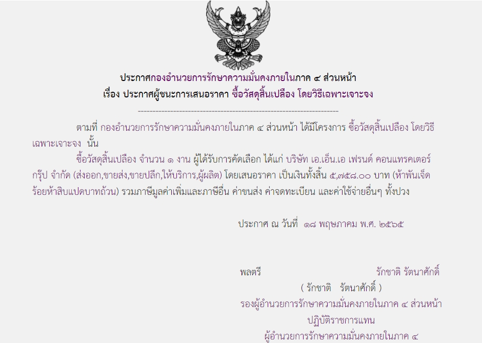 ประกาศผู้ชนะการเสนอราคา ซื้อวัสดุสิ้นเปลือง โดยวิธีเฉพาะเจาะจง