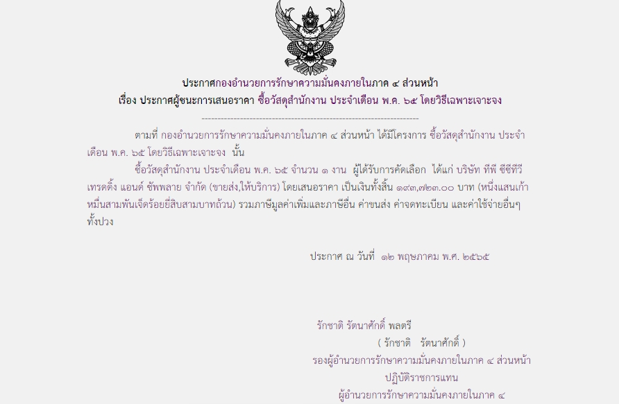 ประกาศผู้ชนะการเสนอราคา ซื้อวัสดุสำนักงาน ประจำเดือน พ.ค. 65 โดยวิธีเฉพาะเจาะจง