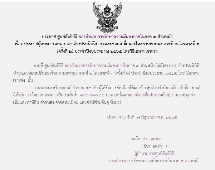 จัดซื้อ จัดจ้างประกาศผู้ชนะการเสนอราคา ประกาศผู้ชนะการเสนอราคา จ้างปรนนิบัติบำรุงและซ่อมเปลี่ยนอะไหล่ยานพาหนะ งวดที่ 2 ไตรมาสที่ 3 (ครั้งที่ 2) ประจำปีงบประมาณ 2565 โดยวิธีเฉพาะเจาะจง June 9, 2022 419 Share Facebook Twitter Google+ Telegram LINE