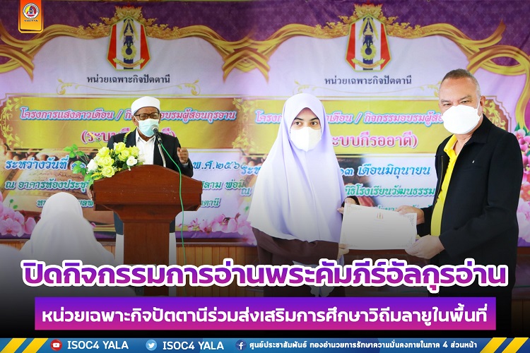 เมื่อวันที่ 13 มิถุนายน 2565 เวลา 14.00 น. ที่ห้องประชุม มูลนิธิโรงเรียนวัฒนธรรมอิสลาม ตำบลพ่อมิ่ง อำเภอปะนาเระ จังหวัดปัตตานี พลตรี คมกฤช รัตนฉายา ผู้บังคับหน่วยเฉพาะกิจปัตตานี ลงพื้นที่ร่วมพิธีปิดกิจกรรมการอ่านพระคัมภีร์อัลกุรอ่าน ภายใต้โครงการแสงดาวเดือน ที่จัดขึ้นระหว่างวันที่ 10-13 มิถุนายน 2565 โดยครูผู้สอนศาสนาประจำโรงเรียนดังกล่าวร่วมกันจัดขึ้น เพื่อส่งเสริมให้เยาวชนอ่านคัมภีร์อัลกุรอ่านได้อย่างถูกต้อง สามารถนำไปถ่ายทอดผู้อื่น และใช้ในชีวิตประจำวัน ทั้งสั่งสมผลบุญ ตลอดจนศาสนพิธีต่างๆ ได้อย่างเหมาะสม ก่อนมอบประกาศนียบัตรแก่นักเรียนที่สอบผ่านการอบรมในครั้งนี้ โดยมี คณะครูผู้สอนศาสนาโรงเรียนวัฒนธรรมอิสลาม , กำลังพลจากหน่วยเฉพาะกิจปัตตานี ตลอดจนนักเรียนโรงเรียนวัฒนธรรมอิสลาม เข้าร่วม