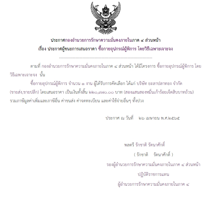 ประกาศผู้ชนะการเสนอราคา ซื้อกายอุปกรณ์ผู้พิการ โดยวิธีเฉพาะเจาะจง