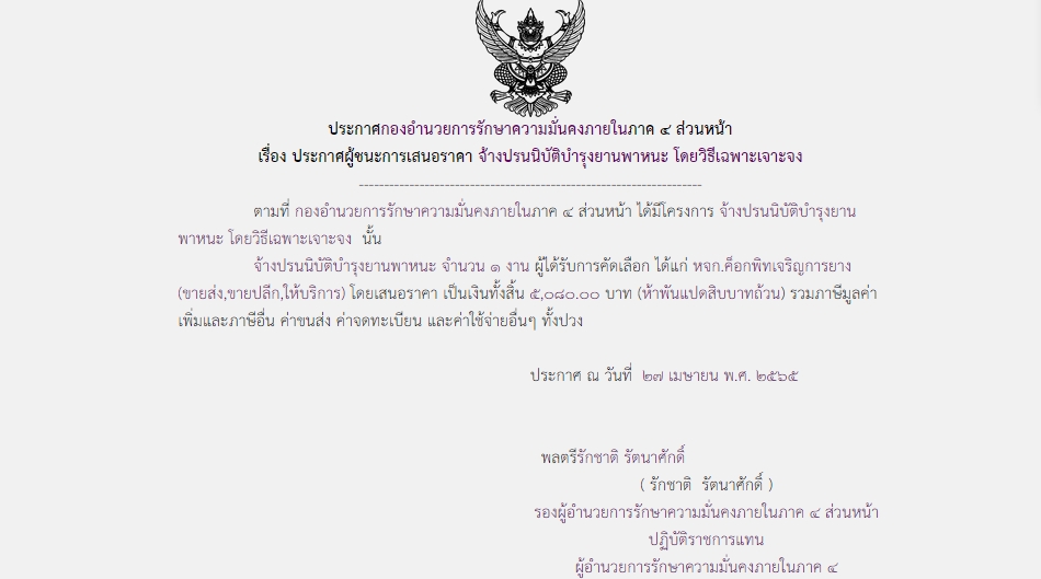 ประกาศผู้ชนะการเสนอราคา จ้างปรนนิบัติบำรุงยานพาหนะ โดยวิธีเฉพาะเจาะจง