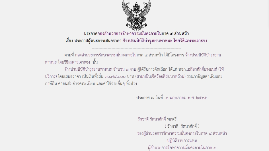 ประกาศผู้ชนะการเสนอราคา จ้างปรนนิบัติบำรุงยานพาหนะ โดยวิธีเฉพาะเจาะจง
