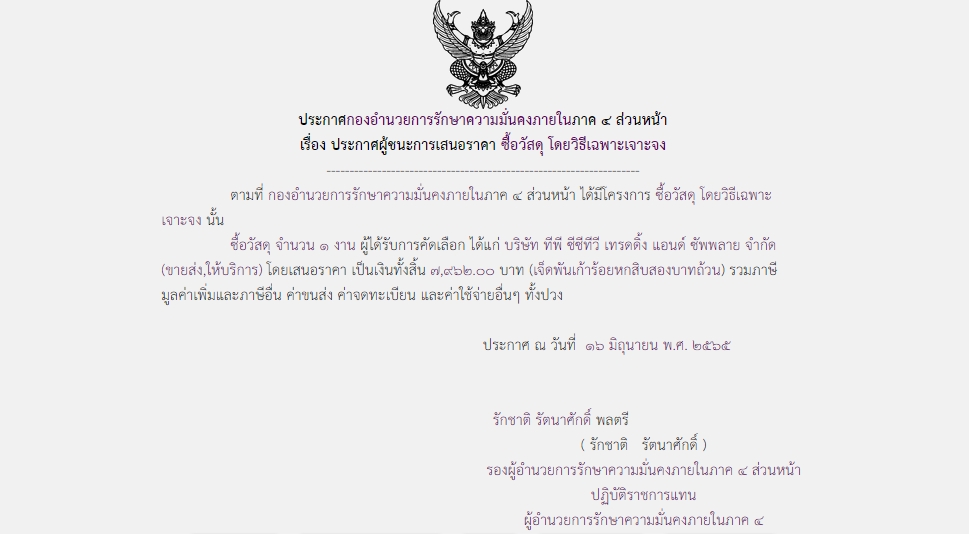 ประกาศผู้ชนะการเสนอราคา ซื้อวัสดุ โดยวิธีเฉพาะเจาะจง