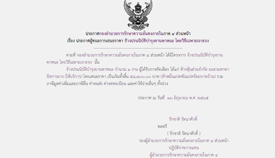 ประกาศผู้ชนะการเสนอราคา จ้างปรนนิบัติบำรุงยานพาหนะ โดยวิธีเฉพาะเจาะจง