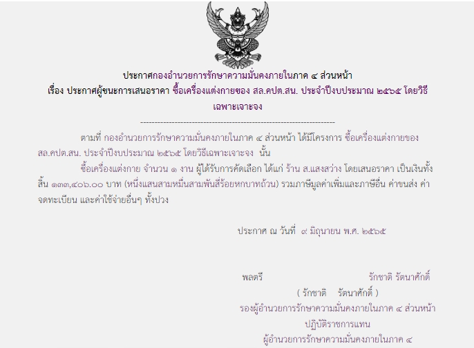 จัดซื้อ จัดจ้างประกาศผู้ชนะการเสนอราคา ประกาศผู้ชนะการเสนอราคา ซื้อเครื่องแต่งกายของ สล.คปต.สน. ประจำปีงบประมาณ ๒๕๖๕ โดยวิธีเฉพาะเจาะจง June 20, 2022 488 Share Facebook Twitter Google+ Telegram LINE