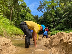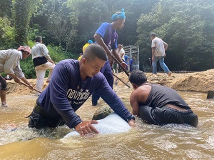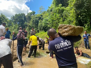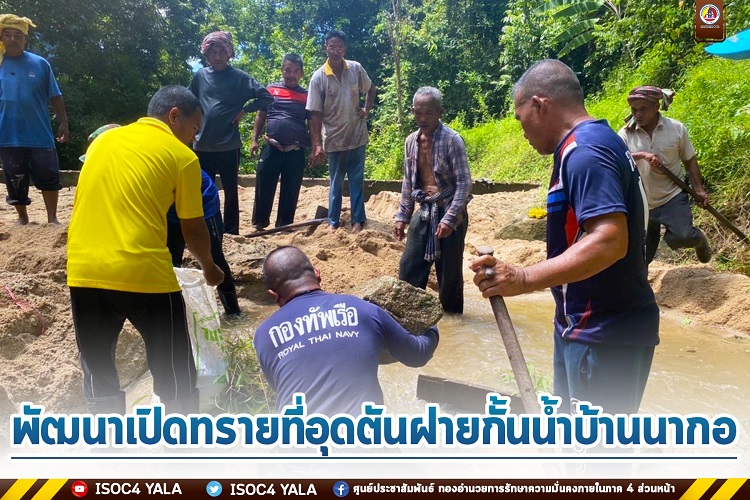 ที่ ฝายกั้นน้ำบ้านนากอ หมู่ที่ 6 ตำบลจอเบาะ อำเภอยี่งอ จังหวัดนราธิวาส กองร้อยทหารพรานนาวิกโยธินที่ 7 หน่วยเฉพาะกิจทหารพรานนาวิกโยธินกองทัพเรือ ร่วมกับ ผู้นำท้องที่, ผู้นำท้องถิ่น และประชาชนจิตอาสา ร่วมกันพัฒนาเปิดทรายที่อุดตันฝายกั้นน้ำบ้านนากอ และได้ตกแต่งภูมิทัศน์ ตัดแต่งกิ่งไม้ที่ขวางเส้นทางน้ำ ซึ่งเป็นแหล่งน้ำในพื้นที่บ้านนากอ ที่ประชาชนได้รับประโยชน์ในการอุปโภคบริโภคจากฝายกั้นน้ำแห่งนี้ ซึ่งมีดินทรายได้ทับถมและอุดตันฝายจึงไม่สามารถที่จะกักเก็บน้ำได้ จึงได้ร่วมกันพัฒนาแหล่งน้ำนี้ขึ้นมา เพื่อประโยชน์สุขของประชาชนในพื้นที่