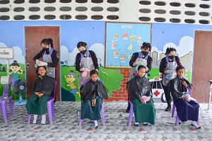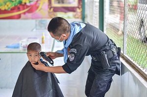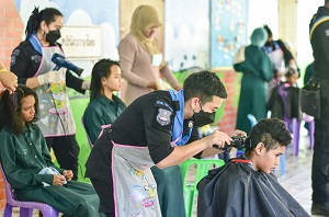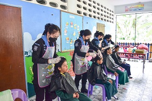 ที่ โรงเรียนบ้านป่าหวัง หมู่ที่ 1 ตำบลบันนังสตา อำเภอบันนังสตา จังหวัดยะลา หน่วยเฉพาะกิจกรมทหารพรานที่ 30 จัดกำลังพลชุดปฏิบัติการเสริมสร้างความเข้าใจ หมวดทหารพรานหญิง 30 นำยาเวชภัณฑ์ น้ำยาหมักเหา เข้าให้บริการหมักผมกำจัดเหาให้กับนักเรียนหญิงที่มีปัญหาเรื่องเหาบนศีรษะ ตามโครงการ “เกศา…สานรักสานสัมพันธ์” พร้อมให้บริการตัดผมให้กับนักเรียนชาย ซึ่งมีเด็กนักเรียนตั้งแต่ชั้นอนุบาล 1 – ชั้น ป.6 เข้ารับบริการอย่างทั่วถึง เพราะความผูกพันธ์นั้นต่างจากความรัก เราจึงเลือกสร้างทั้งสองสิ่งพร้อม ๆ กัน เพื่อเสริมสร้างความสัมพันธ์อันดีระหว่างกัน สุขภาพอนามัยของเด็กในวัยเรียนเป็นเรื่องสำคัญ เรื่อง “เหา” บนศรีษะ ก็เป็นอีกปัญหาของเด็กนักเรียนหญิงที่ต้องได้รับการดูแล