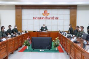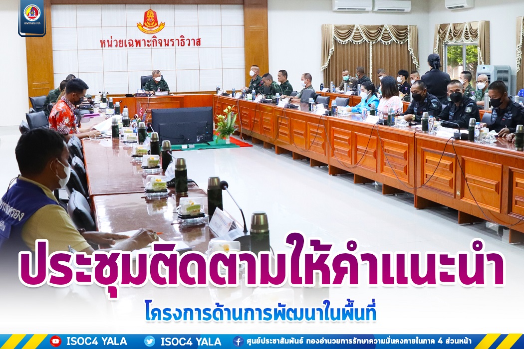 วันที่ 24 มิถุนายน 2565 เวลา 09.30 น. ณ ห้องประชุม หน่วยเฉพาะกิจนราธิวาส ค่ายกัลยาณิวัฒนา ตำบลกะลุวอ อำเภอเมือง จังหวัดนราธิวาส พลตรี เฉลิมพล จินารัตน์ ผู้อำนวยการสำนักส่วนพัฒนายุทธศาสตร์ กองอำนวยการรักษาความมั่นคงภายในภาค 4 ส่วนหน้า เป็นประธานการประชุมติดตามให้คำแนะนำคณะทำงานประสานงานเพื่อสร้างความร่วมมือในการขับเคลื่อนและบูรณาการด้านการพัฒนาในระดับจังหวัด ของกองอำนวยการรักษาความมั่นคงภายในภาค 4 ส่วนหน้า ปี 2565 (ไตรมาส 3 ) ผ่านกลไกสภาสันติสุขตำบล รับทราบผลการปฏิบัติงานในห้วงที่ผ่านมา พร้อมหารือถึงปัญหาข้อขัดข้องในการปฏิบัติงาน เพื่อดำเนินการแก้ไขกระบวนการทำงาน ให้ตอบสนองความต้องการแก่ประชาชนมากที่สุด โดยมี คณะทำงานจากส่วนราชการจังหวัดนราธิวาส , ผู้แทนศูนย์อำนวยการบริหารจังหวัดชายแดนภาคใต้ , ผู้แทนหน่วยเฉพาะกิจในพื้นที่ ร่วมประชุม