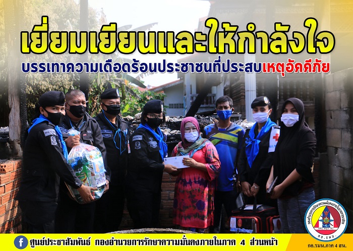 โดยทางหน่วยเฉพาะกิจกรมทหารพรานที่ 41 ได้มอบถุงยังชีพ และเงินช่วยเหลือครอบครัวจำนวน 2,000 บาท เพื่อเป็นการช่วยเหลือบรรเทาความเดือดร้อนในเบื้องต้น และทางหน่วยจะได้ประสานกับส่วนที่เกี่ยวข้องในการให้การช่วยเหลือซ่อมแซมบ้านพักอาศัยให้ต่อไป