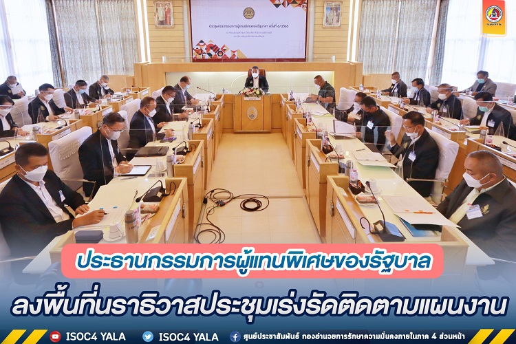 วันนี้ (29 มิ.ย.65) พลเอก ชัยชาญ ช้างมงคล ประธานกรรมการผู้แทนพิเศษของรัฐบาลในการแก้ไขปัญหาจังหวัดชายแดนภาคใต้ เป็นประธานการประชุมคณะกรรมการผู้แทนพิเศษของรัฐบาลฯ ครั้งที่ 6/2565 ที่ห้องประชุม สำนักงานอธิการบดีมหาวิทยาลัยนราธิวาสราชนครินทร์ อำเภอเมืองนราธิวาส เพื่อติดตามผลการขับเคลื่อนแผนงาน/โครงการที่เกี่ยวข้อง ภายใต้แผนบูรณาการขับเคลื่อนการแก้ไขปัญหาจังหวัดชายแดนภาคใต้ และผลสัมฤทธิ์ของการขับเคลื่อนในห้วงไตรมาสที่ 1-3 ของปีงบประมาณ พ.ศ.2565 ซึ่งมีนายไพโรจน์ จริตงาม รองผู้ว่าราชการจังหวัดนราธิวาส พลโท เกรียงไกร ศรีรักษ์ แม่ทัพภาคที่ 4 นางทัศนีย์ ผลชานิโก รองอธิบดีกรมประชาสัมพันธ์ นายศรัทธา คชพลายุกต์ รองเลขาธิการ ศูนย์อำนวยการบริหารจังหวัดชายอดนภาคใต้และคณะผู้เกี่ยวข้องเข้าร่วมการประชุม