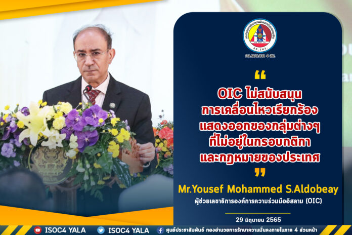 ประชาสัมพันธ์ข่าวประชาสัมพันธ์ “OIC ไม่สนับสนุนการเคลื่อนไหวเรียกร้อง แสดงออกของกลุ่มต่างๆ ที่ไม่อยู่ในกรอบกติกา และกฎหมายของประเทศ” June 30, 2022 469 Share Facebook Twitter Google+ Telegram LINE Mr.Yousef Mohammed S.Aldobeay ผู้ช่วยเลขาธิการองค์การความร่วมมืออิสลาม (OIC) 29 มิถุนายน 2565 ศูนย์ประชาสัมพันธ์ กองอำนวยการรักษาความมั่นคงภายในภาค4ส่วนหน้า